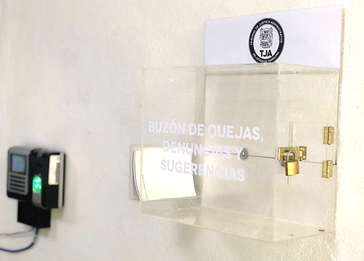 Buzón de quejas, denuncias y sugerencias, puesto al alcance de los usuarios y visitantes del Tribunal de Justicia Administrativa.